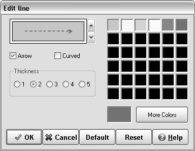 In the edit line window the color of each line player can be altered. This is achieved by selecting a color from the quick color select area or by pressing the more colors button to open a color dialog.